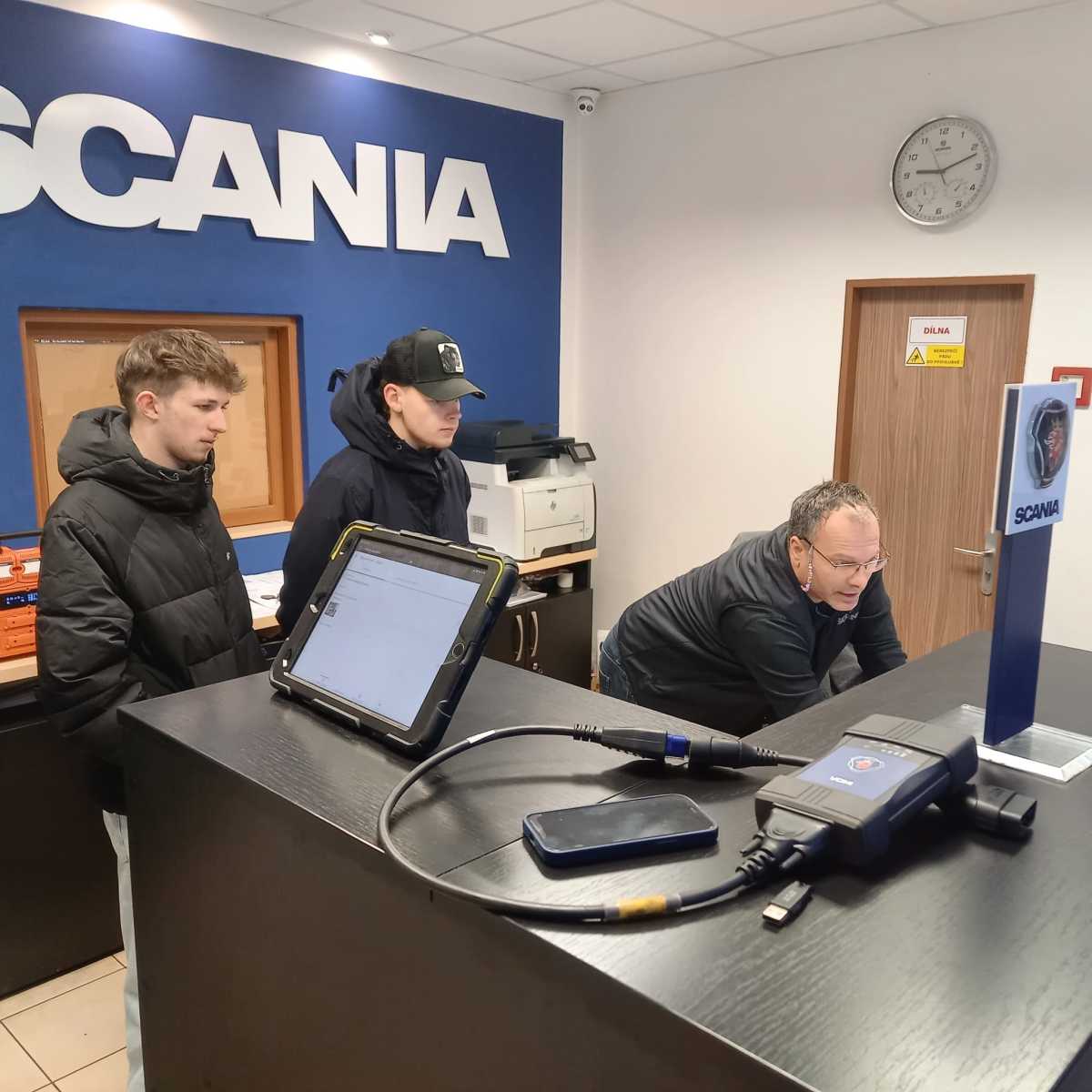 Na začátku jsme se sešli v konferenční místnosti, kde nám jeden z vedoucích pracovníků podniku představil historii a současnost společnosti Scania. Poté jsme se přesunuli do servisních hal, kde jsme mohli sledovat jednotlivé fáze oprav. Nejvíce nás zaujala moderní diagnostická zařízení a specializovaná pracoviště pro opravy motorů a podvozků.