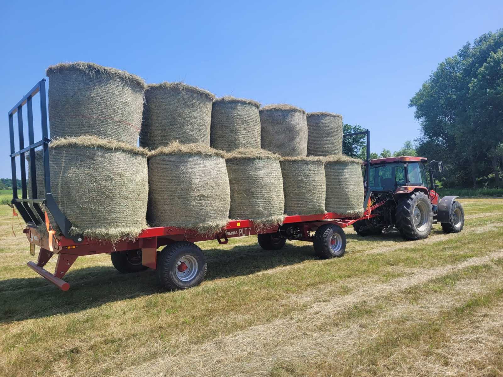 V neděli 15. června jsme poprvé využili nově pořízený přepravník balíků WTC PLT 7. Nosnost je 8,8 t a má 7 metrů ložné plochy. Přepravník balíků dodala firma NEWIA s.r.o. Staňkov a vejde se na něj 15 balíků o průměru 120 cm. Letošní počasí nám příliš nepřálo, ale využili jsme první příležitost a zadařilo se, kromě pár balíků máme seno pod střechou.