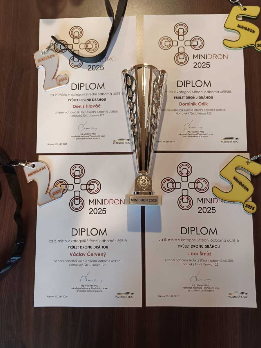 Dne 23. září 2025 se v Klatovech konalo krajské kolo soutěže Minidron 2025, kterého se zúčastnili i žáci naší školy – Denis Hlaváč, Václav Červený, Dominik Orlík a Libor Šmíd.